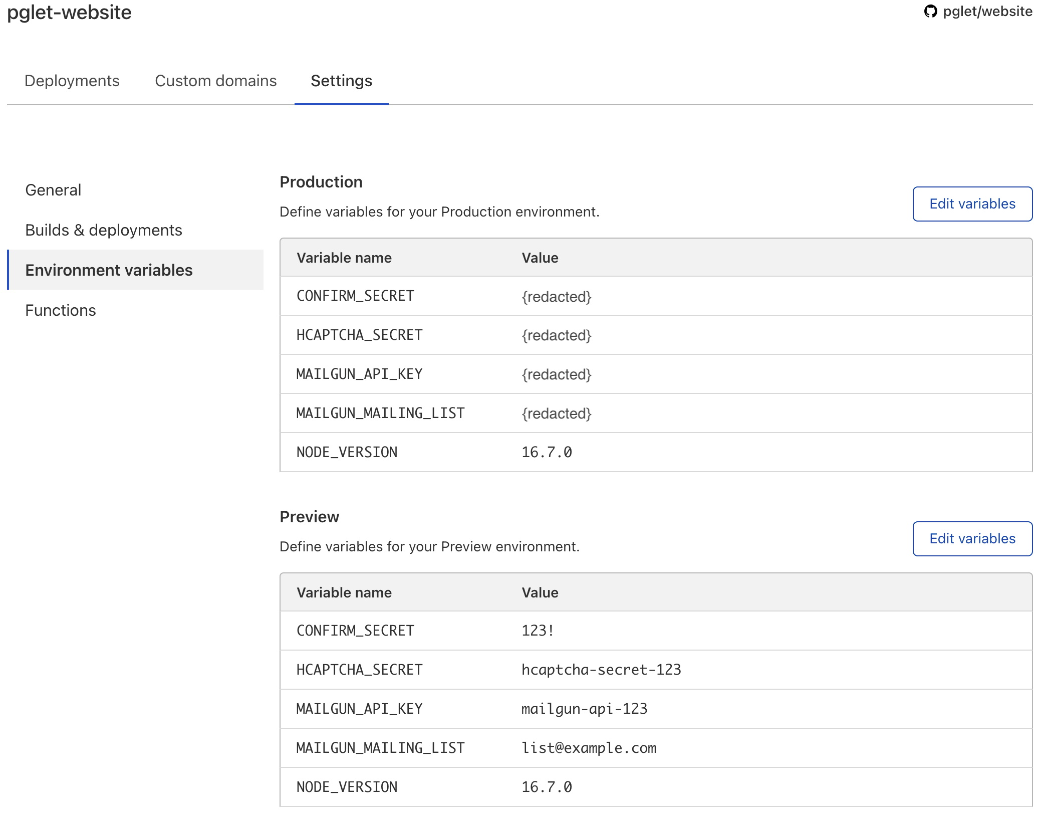 Do not put real secrets into "Preview" environment variables if your project in a public repository. Any pull request to the repository publishes "preview" website to a temp URL which is visible to everyone in commit status. Therefore, it's possible for the attacker to submit malicious PR with a function printing all environment variables and then run it via temp URL.