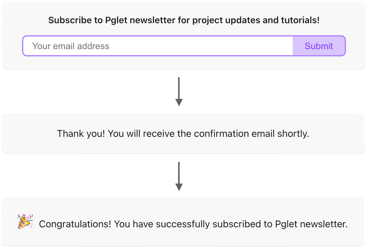 In the next article we will build an interactive Python app using Pglet for sending newsletter to Mailgun mailing lists. Make sure to subscribe to Pglet mailing list not to miss it!