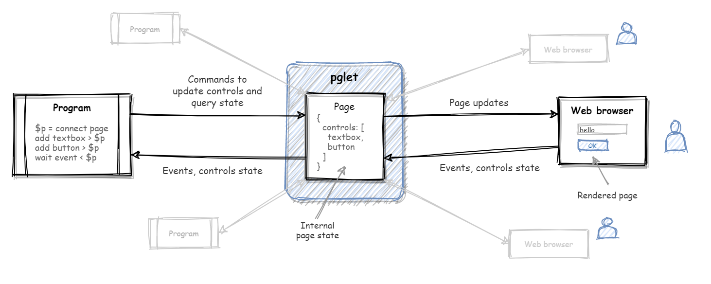 Pglet is the tool that hosts virtual pages for you. Think of a page as a "canvas", a "hub", an "app" where both your programs and users collaborate. Programs use an API to control page contents and listen to the events generated by users. Users view page in their browsers and continuosly receive real-time page updates. When in- API is just plain-text commands like "add column A", "add text B to column A", "get the value of textbox C", "wait until button D is clicked" - it's easy to format/parse strings in any programming language.